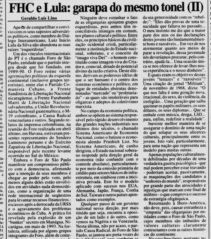 Aqui, Geraldo Luís Lino (Tribuna da Imprensa, 20/08/1994) mostra que já conhecia a "estratégia das tesouras" do PT/PSDB: FHC e Lula são farinhas do mesmo saco. E tome Foro de São Paulo, Diálogo Interamericano, Fundações Ford e Rockefeller, etc.